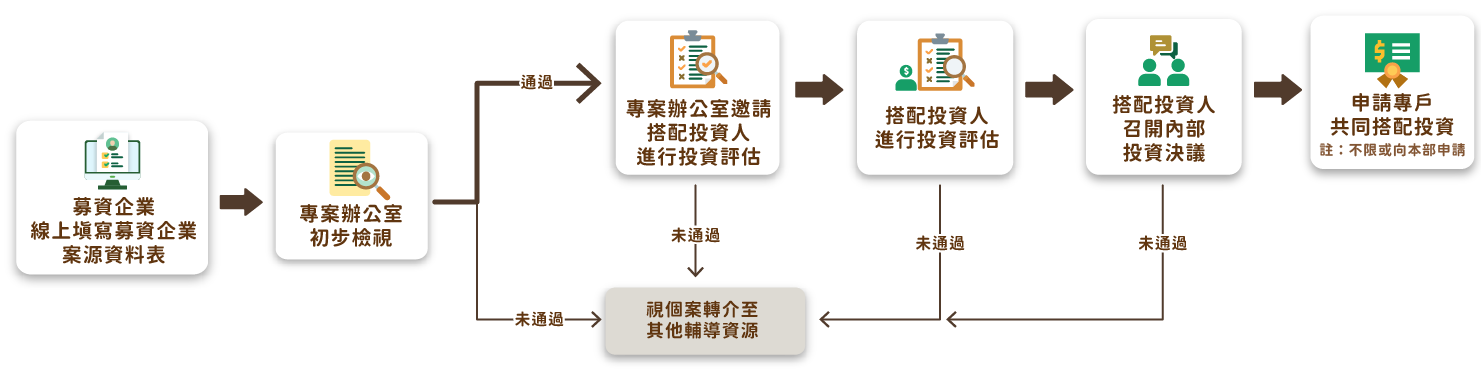 募資企業請先線上填寫募資企業案源資料表。線上填寫完募資企業案源資料表後,本方案專案辧公室會進行初步檢視,若募資企業具有一定的投資潛力時專案辦公室會協助將募資企業轉介至搭配投資人進行投資評估或其它政府資源,幫助企業取得資金或其他所需資源。